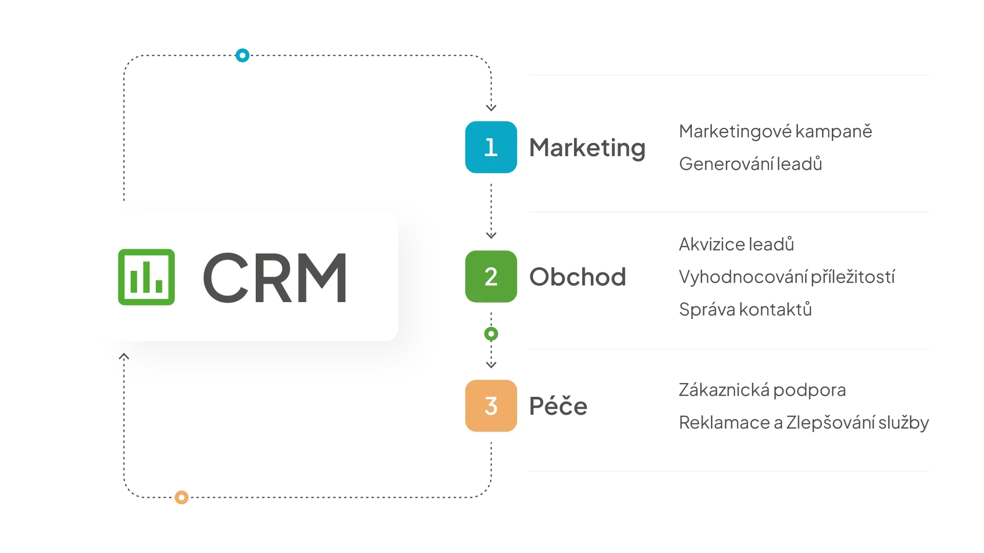 Cieľom CRM je budovať spokojný vzťah s existujúcimi zákazníkmi a efektívne získavať nových. V rámci CRM potom evidujete všetky aktivity, ktoré so zákazníkom súvisia a to od akvizície a prvého kontaktu cez rozvoj lojality a riešenie klientskych problémov až po koniec obchodného vzťahu.