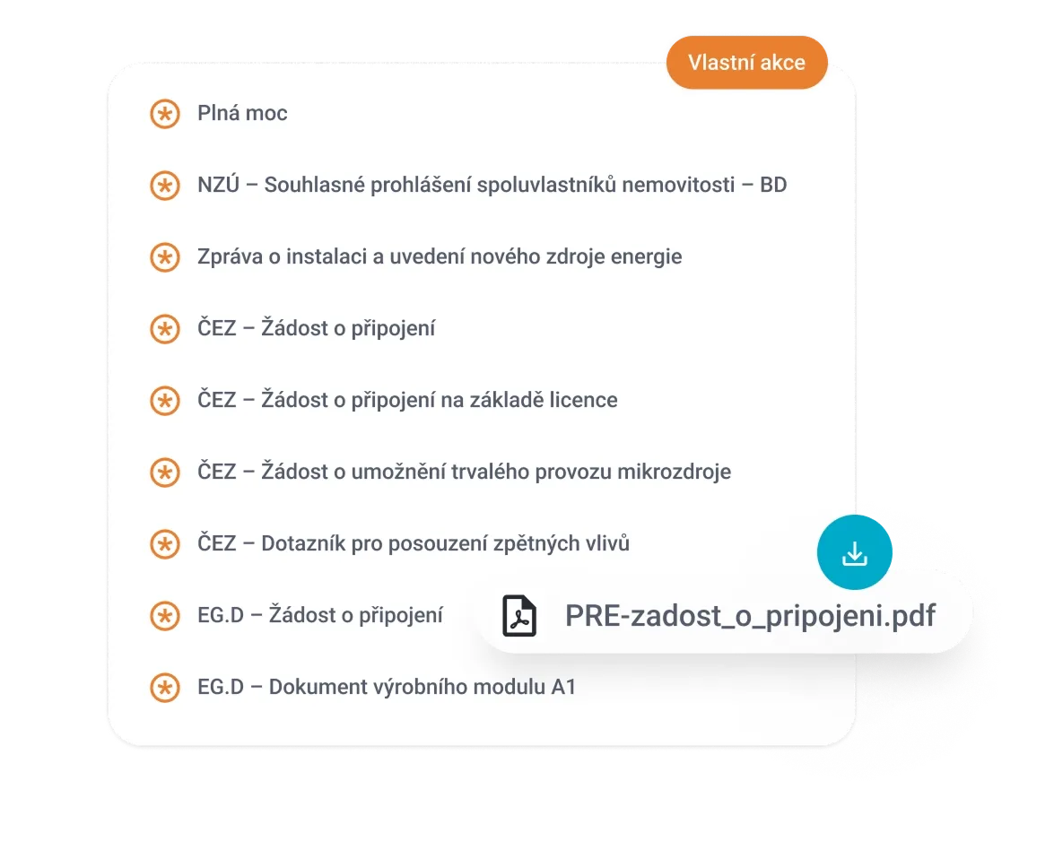 V spolupráci s partnermi Bubble Development a Wue, máme pripravené riešenie, s ktorým vygenerujete potrebné dokumenty pre NZÚ, ČEZ, PRE, ED.G a ďalších, vrátane údajov klienta na jedno kliknutie.