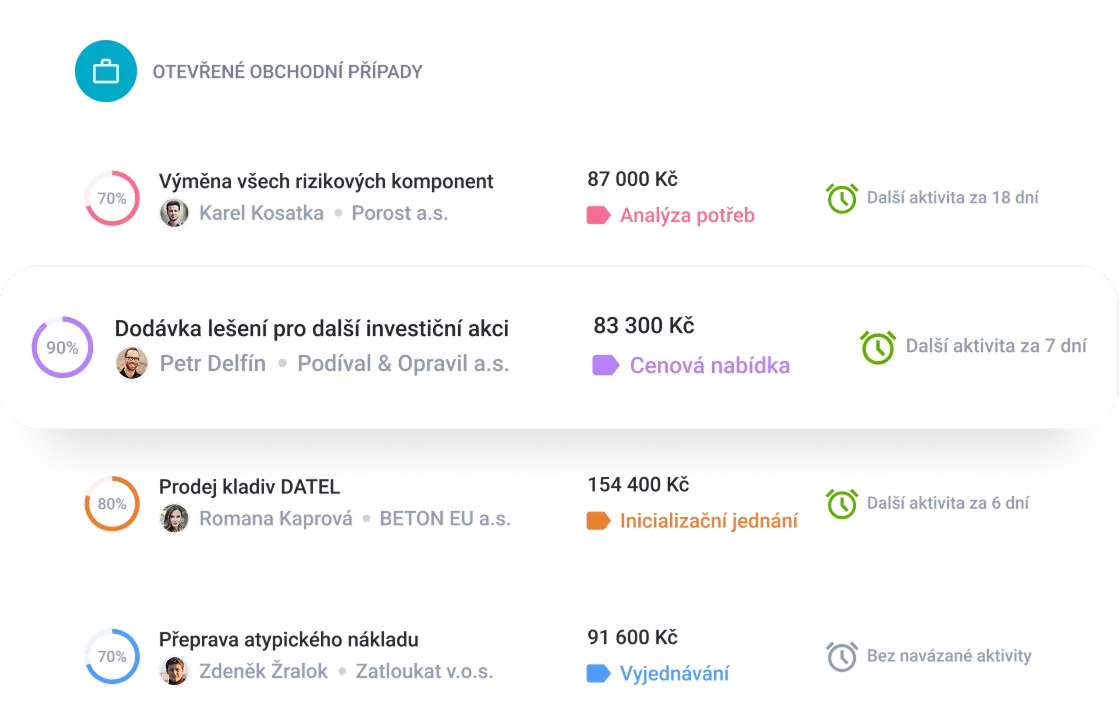 Všetky kľúčové informácie o vašich klientoch nájdete na jednom mieste. Kontakty, cenové ponuky a prehľad všetkého, čo ste s nimi riešili osobne, telefonicky aj e-mailom. Ušetríte tak čas, zjednodušíte obchodné procesy a posilníte vzťahy so zákazníkmi.